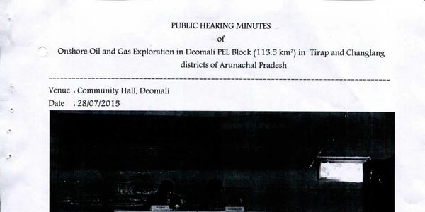 A collection of 3 documents from 2015 when a public meeting was held at Deomali on onshore gas and oil exploration in Deomali PEL Block of 113.5 square kilometers.